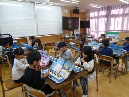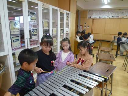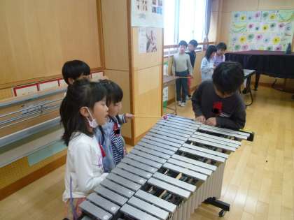 きらきらぼしの曲に合わせて、鉄琴を使いました。たたきかたや持ち方に気を付けています。