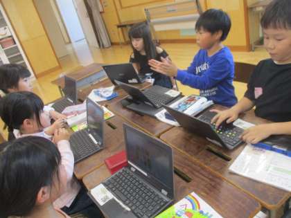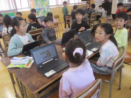 音楽では、繰り返しのリズムをつなげて、おまつりの音楽をつくりました。クロムブックを使って、試行錯誤しながら自分のリズムをつくりました。また、つくったリズムを友達とつなげるときに、どんな順番でたたくか、強弱やスピードはどうするか、工夫を取り入れて活動していました。友達と音楽をつくる楽しさ、グループによってリズムが異なる面白さに気付けたようです。