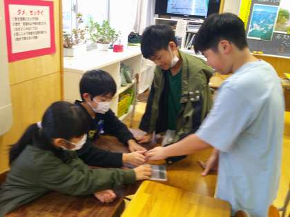 富山市科学博物館から、常願寺川にある石や、上流から河口までのパネルなどをお借りしたので、みんなで見ました。
