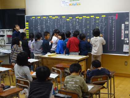 ごごごじに・・・・という問題に「午・後・五」と答えを書いていく子供たち。