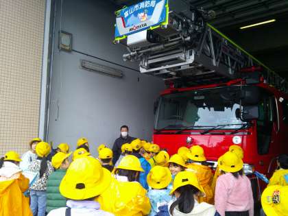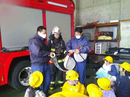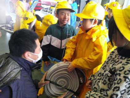 今日は、消防署見学へ行きました。消防署では、要請があった際に素早く出動する工夫や消防車の種類についてお話を聞き、救急車の中の様子や放水訓練の様子を見学させていただきました。子供たちは、実際に使うホースを持って「重い!」と驚いたり、気になることを意欲的に質問したりして、楽しく学習していました。