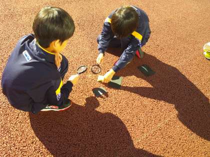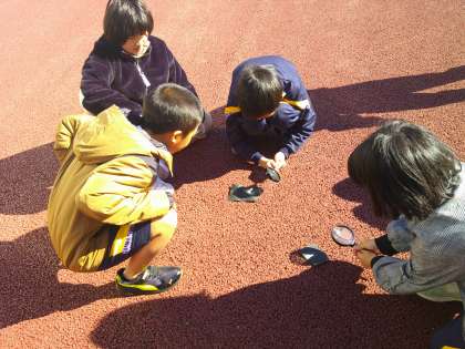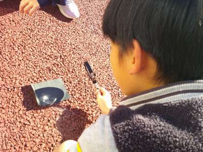 理科の学習では、「太陽の光」について調べています。今日は、虫眼鏡を使って太陽の光を集めると、どうなるのかを調べました。色の濃い紙を地面において虫眼鏡で光を集めると「煙が出た!」「小さな火が出たよ!」と、紙が熱くなる様子を観察することができました。危険も伴う実験でしたが、安全に気をつけながら太陽の力を実感する子供たちでした。