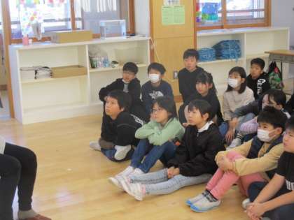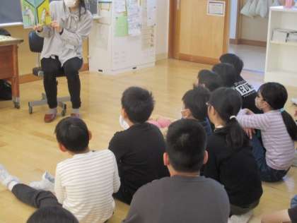 今日は、「おなかのかわ」「バナナのはなし」という絵本のお話を聞きました。次は、どうなるのだろうと子供たちは興味をもってきていました。