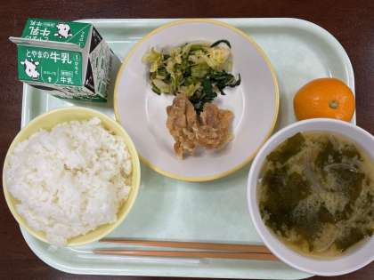 【献 立】 ごはん 牛乳 鶏肉のから揚げ 小松菜ひたし じゃがいものみそ汁 みかん