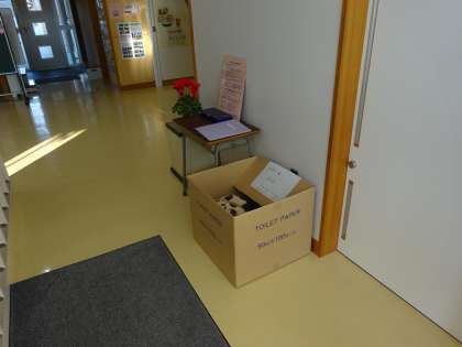 PTAで、バザーの提供品を集めています。正面玄関来賓用下足受けの近くにBOXがありますので、そちらへ入れていただけるとありがたいです。
