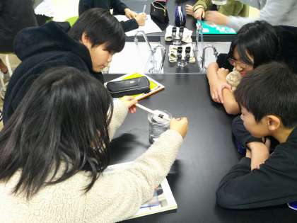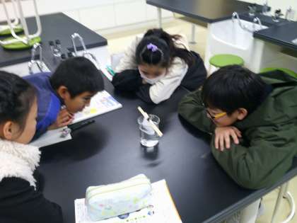 ゆらゆらと溶け出る食塩の様子を、不思議そうに眺めていました。