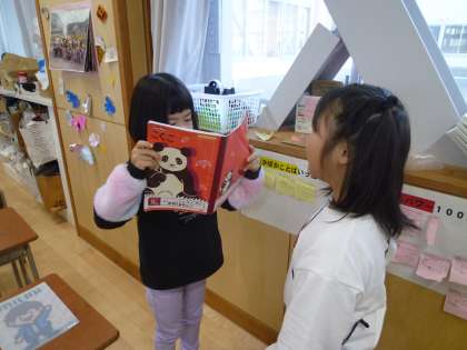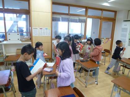 友達が、今楽しいことを紹介し合いました。ペアを見つけて、取り組んでいます。
