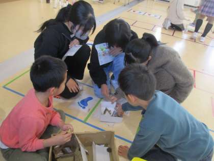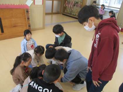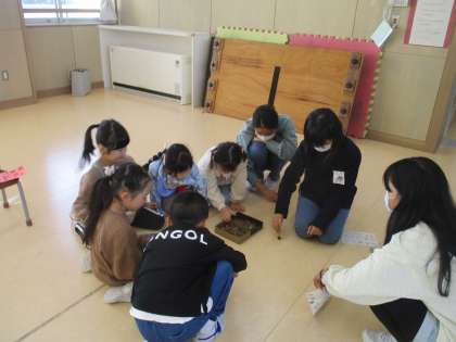 1年生から秋まつりに招待してもらい、秋のおもちゃで遊びました。迷路やもぐらたたき、的当てなどいろいろな遊びがあり、1年生と一緒に楽しみました。