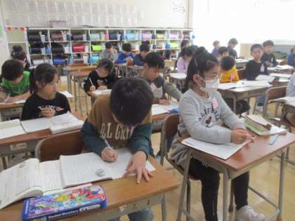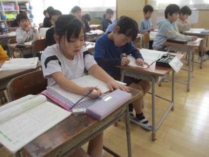 国語科「わたしはおねえさん」の学習では、登場人物と自分をくらべてながら感想を書きました。今までの学習を通して、心に残っていることを中心に書きました。一人一人が自分の経験を振り返りながら、課題について真剣に考えて書いている姿がとてもすばらしかったです。自分の思いや考えを書き表す力をさらに伸ばしていきたいです。