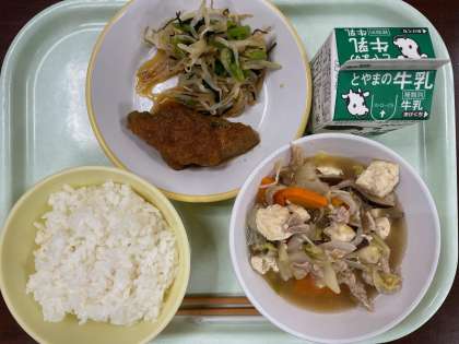【献 立】 ごはん、牛乳 揚げ魚のみぞれだれ 昆布和え はくさいなべ