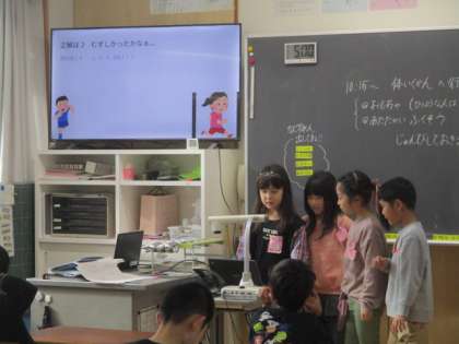 係活動では、人権週間ということで「人権クイズ」を作っていました。友達が泣いていたらどうするか、縄跳びがぶつかったときに何というかなど、具体的な場面で問題を出していました。より仲良く、みんなで楽しく過ごそうとする意識を高めようと、係で工夫している姿がとても立派です。