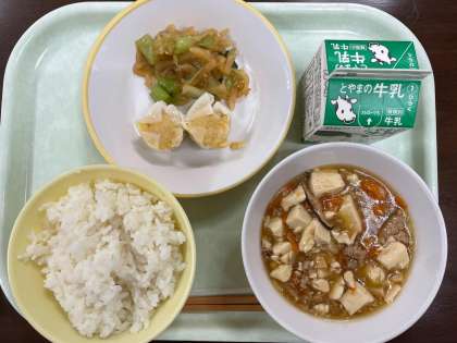 【献 立】 ごはん 牛乳 にんじんシューマイ 大根ナムル マーボー豆腐