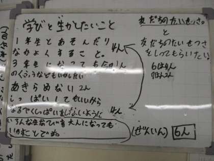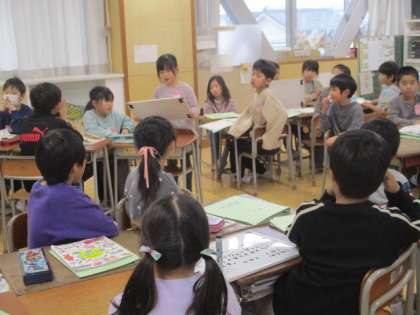 おもちゃづくりや遊びを通しての学びをグループで話し合いました。分かりやすく説明する力を伸ばすこと、失敗してもあきらめないこと、一緒に試行錯誤してくれる友達の大切さ、人を楽しんでもらう喜びなどを学んだり、気付いたりすることができたようです。その力を大人になっても大切にしたいと考えている2年生です。