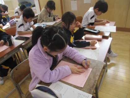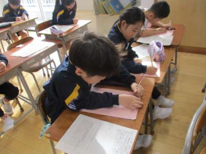 お家で考えてきた「新年のちかい」を清書しました。新しい年が始まり、3年生に向けて頑張ろうという気持ちを込めて、丁寧に書いていました。子供たちの表情や文字から、やる気が感じられました。それそれの目当ての達成に向けて頑張る子供たちを見守っていきたいと思います。