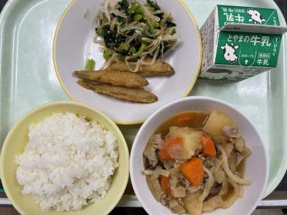 1月15日(月) 【献 立】 ごはん 牛乳 わかさぎのフリッター ごまびたし 豚肉の南蛮煮