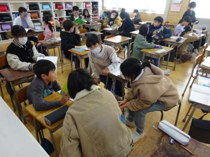 5年生の家庭科では「家族の団らん」について学習していました。 各自が考えた取組を紹介し合っていました。