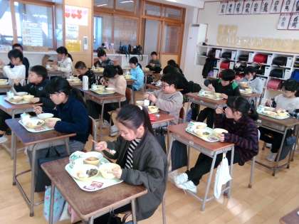 今日も給食をおいしく食べています。 放送を聞いたり、近くの友達と話しながら食べています。