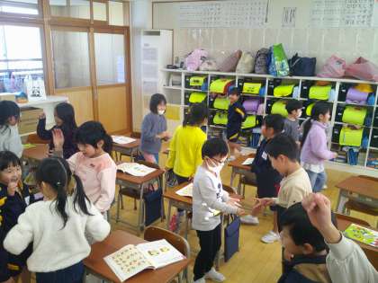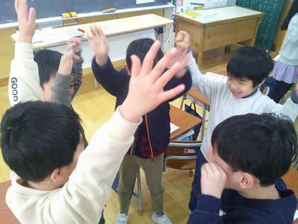 教科書に載っているおちゃらかほいを歌いながらあそびました。速さをかえたり、人数をかえたりして大盛り上がりでした。「7人でできた。」と話してくれる子もいました。