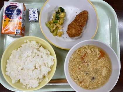 【献 立】 ごはん 超回復オレンジジュース ささみフライ コーン和え かきたま汁 ポケットチーズ