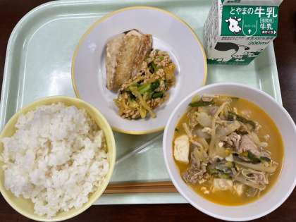 【献 立】 ごはん 牛乳 さばの塩焼き ねばーる納豆和え 全集中ごまキムチ鍋