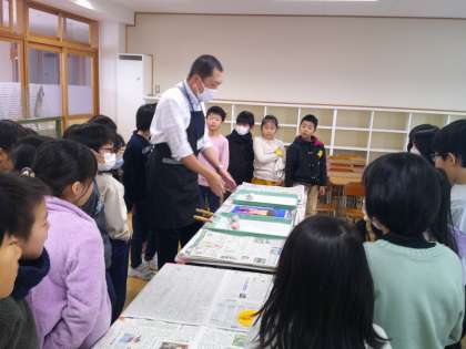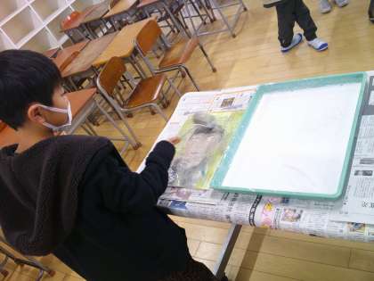 今日の図工では、版画を画用紙に刷る作業を行いました。業者の方から、製版のしかたを教えていただきました。