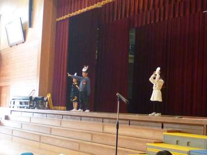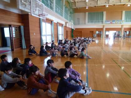 授業を見ていただいた後に、幼稚園児と交流会をしました。もうじゅうがりゲームやじゃんけんをして遊びました。最後には、プレゼントも渡し、「入学を楽しみに待っているよ」「たくさん水をやってね」と伝えることができました。