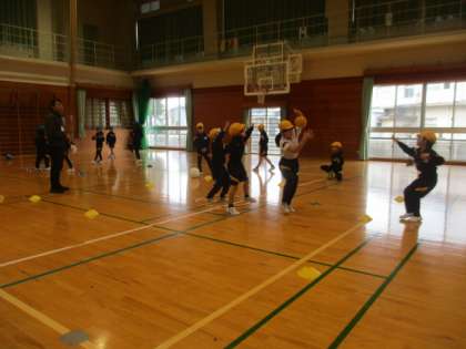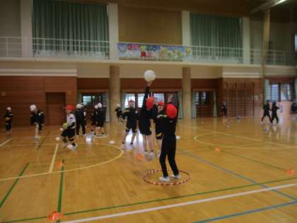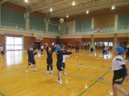 体育では、ボールを投げたりキャッチしたりする運動をしています。今日は、コートの中で攻めと守りに分かれてボールを投げたり、キャッチを防いだりと、ゲームに向けて練習をしました。投げるタイミングや方向を工夫したり、友達と声をかけ合ったりする姿が見られ、各団で盛り上がりながら練習をしてました。