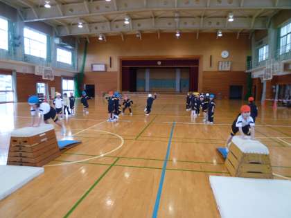 手の向きや、腰の位置に気を付けて、跳びました。高い段にもチャレンジしています。