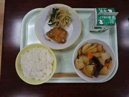 【献 立】 ごはん 牛乳 魚の甘みそかけ おひたし 関東だき