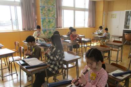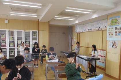 リコーダーに鉄琴と鍵盤ハーモニカを加えると音が重なり、よりすてきなメロディとなりました。春休み中も練習しましょう!