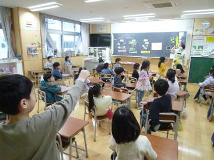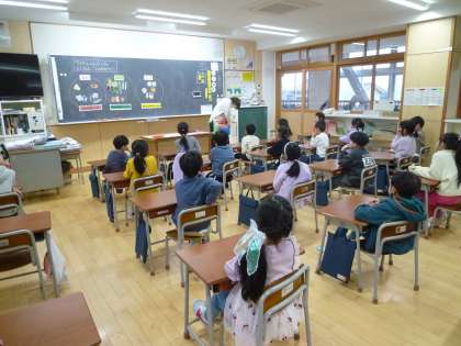 好き嫌いをせず食べるとどんな良いことがあるのか話し合いをしました。小腸の長さのテープを実際に持って、びっくりしましたね。