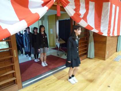 緊張した表情で入場しています。
