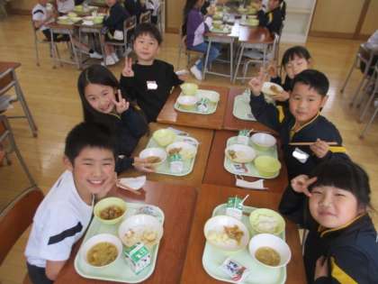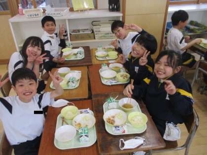 3学期最後の給食でした。友達と楽しく会話をしながら、今日も美味しそうに食べており、しっかり完食していました。これからもたくさん食べて、大きく育ってくださいね。