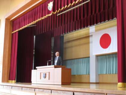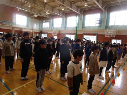 校長先生のお話を真剣に聞きます。「1年間の自分の成長を振り返りましょう」「1年間一緒に過ごした友達や先生、教室に感謝の気持ちをもちましょう」。