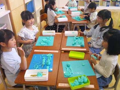 今週の図工では粘土を使った学習を行いました。粘土を細くこねたり小さく丸めたりと、思い思いのご馳走を作って楽しみました。作品作りが終わると、グループで自分の作った作品を紹介し合いました。