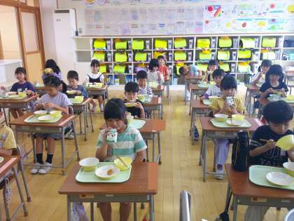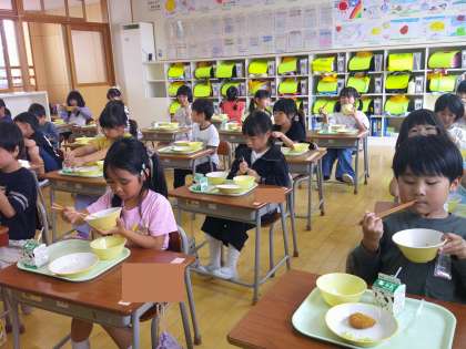 給食当番の仕事にも慣れ、上手に配膳することができるようになりました。食べることも大好きな1年生。3時間目頃から「おなかすいた〜!」と給食を待ちわびています。今日もおしくいただきました。