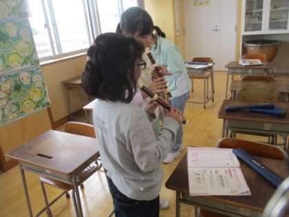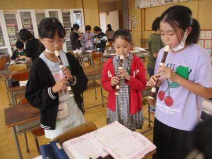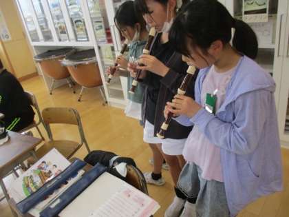 「小さな約束」をリコーダーで演奏する練習をしました。友達とリズムを合わせたり、体の向きを考えたりするなど、より美しい響きになるように工夫して練習していました。