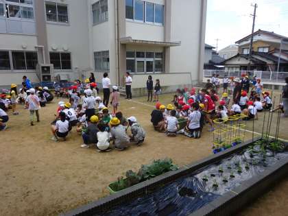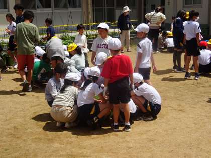 今日は、赤団と白団が班ごとにひまわりの種をまきました。