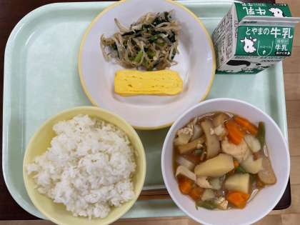 【献 立】 ごはん 牛乳 厚焼き卵 小松菜のごま和え 関東だき