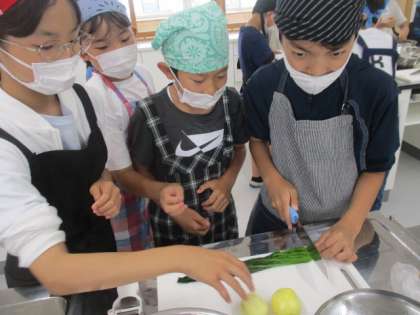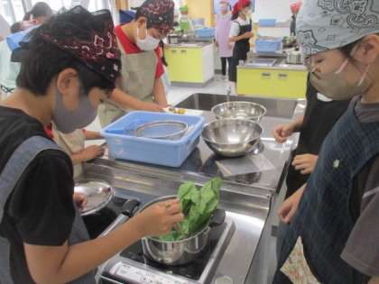 ゆで料理のポイントを学ぶために、ほうれん草のおひたしとゆでいもを作りました。美味しくゆでるために、調理の順番やゆで時間、盛りつけなどを考えて取り組みました。班のみんなで分担・協力しながら、効率よく良く料理することの大切さも学びました。
