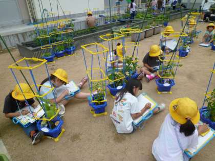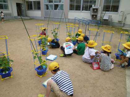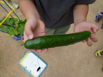 大きさ、色、形など、前回と比べた成長を書きました。収穫したらどうやって食べようかなとわくわくしているようすです。なかには、大きくそだっている野菜もあったので収穫した子供もいました。