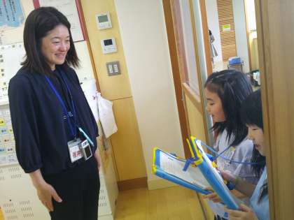 生活科では、奥田北小学校のことをもっと知るために、学校で働いている先生方へインタビューを始めました。授業では、友だち同士でインタビューの練習を行い、休み時間には、はきはきと先生方へインタビューしました。たくさんの先生方と触れ合うことが楽しかったようで、次回のインタビューを心待ちにしている様子が見られました。