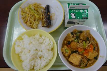 【献 立】 ごはん 牛乳 いわしの土佐煮 はりはり和え 厚揚げと小松菜のごまみそマーボー