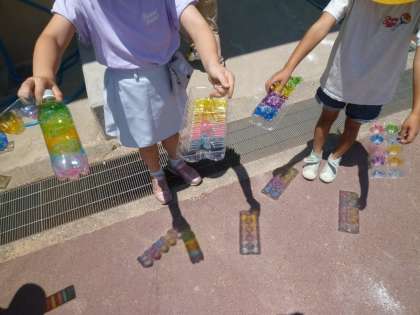 ペットボトルや卵パックに色を付けて、光を当ててみると…とても綺麗な色が地面にうつりました。光のうつり方を考えながら、次はうちわを作ってみましょう。