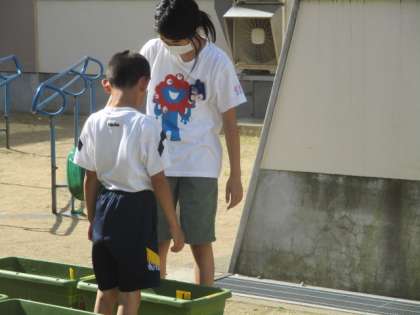 ひまわりの様子を見に来た他の学年の友達と声を掛け合う様子も見られます。