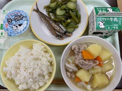 【献 立】 ごはん 牛乳 ししゃもの米粉揚げ 茎わかめの中華和え 塩肉じゃが ヨーグルト