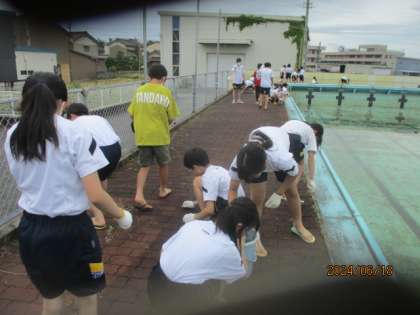 プール開きに向けてプールサイドの草むしりに取り組みました。各色団に分かれコンクリートの間から生えている雑草を丁寧に抜いたり、落ちた草を集めました。みんなが気持ちよくプールに入ってくれるようにがんばった5年生でした。