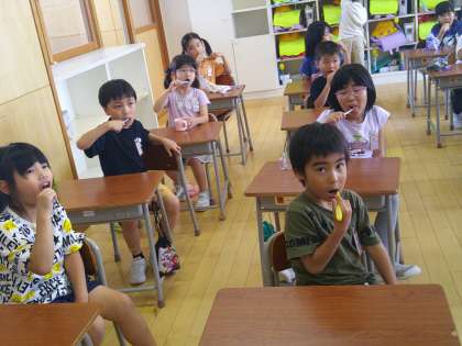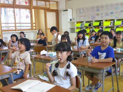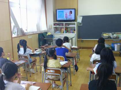 学校での給食後の歯磨きの時間では、各クラスで歯磨きのめあてを決めて取り組んでいます。2組では、歯磨き動画を見ながら、楽しく歯磨きの仕方を確認しています。