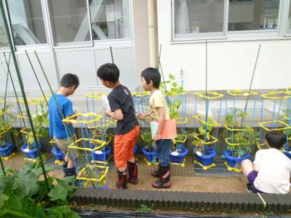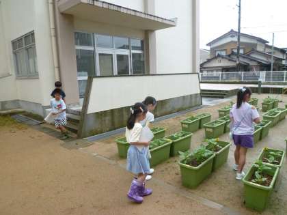 中庭にあるものをメモしました。何があるか、数、色、形などもノートに記すことができました。町探検でも生かしていきましょう。