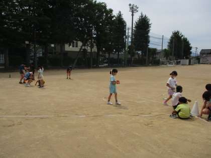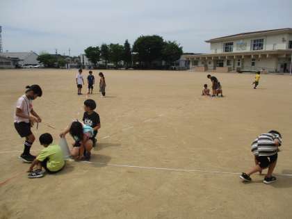 グラウンドで、基準になるところから10mだと思うところに印をつけて、まきじゃくを使って実際の長さを計測しました。